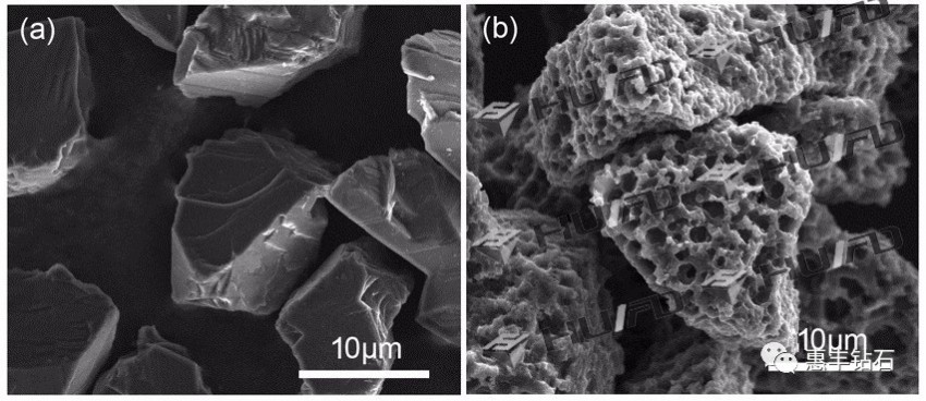 圖6 金剛石磨粒內(nèi)部泡沫化: (a) 未腐蝕; (b)重度腐蝕