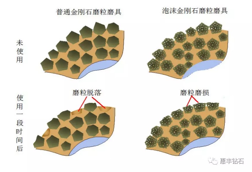 通過(guò)采取相應(yīng)的工藝措施,制備出孔隙率不同的金剛石磨料,從而控制其強(qiáng)度,滿足在不同的接觸壓力下,金剛石磨粒可以通過(guò)自身局部破碎而產(chǎn)生新的微切削刃,而不必通過(guò)修整即可使磨具維持較高的鋒利度,達(dá)到提高磨削效率目的。而且這樣的磨具破碎自銳可以通過(guò)調(diào)整金剛石的泡沫化程度(磨粒中孔徑大小和孔隙率)得以控制,這樣的性能對(duì)于大面積接觸的磨具磨削(如平面磨削等)尤其必要。