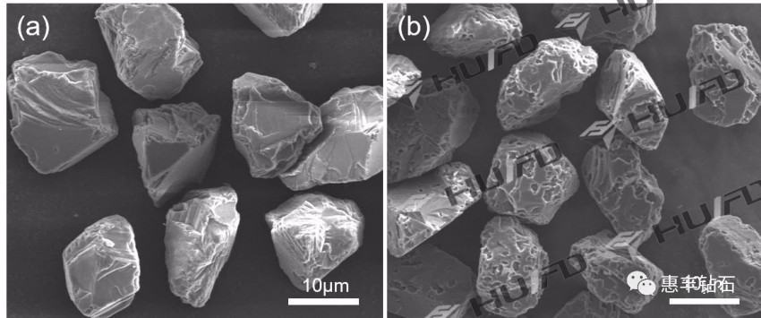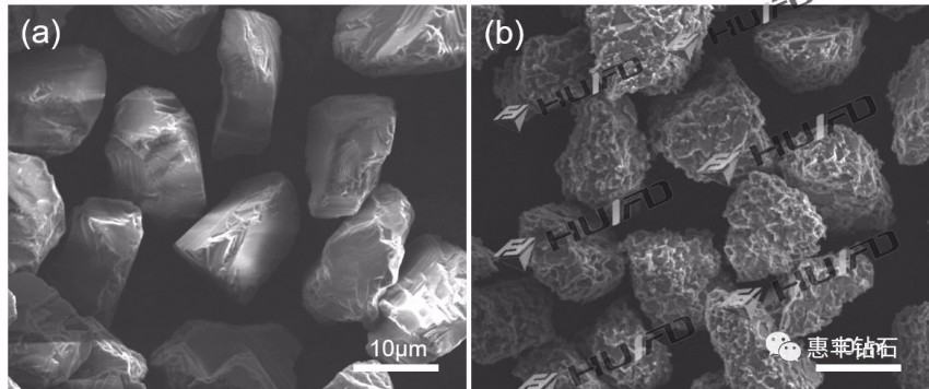 圖4 金剛石磨粒表面粗糙化: (a) 未腐蝕; (b) 輕度腐蝕