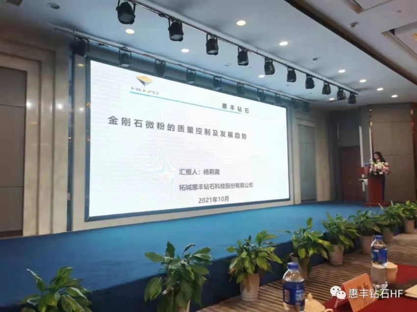 惠豐鉆石營銷總監(jiān)楊莉霞進(jìn)行了大會特邀報(bào)告——《金剛石微粉的質(zhì)量管控及發(fā)展趨勢》。首先詳細(xì)介紹了金剛石微粉的定義及用途、金剛石微粉生產(chǎn)流程及設(shè)備,惠豐鉆石的金剛石微粉質(zhì)量檢測設(shè)備,然后分析總結(jié)金剛石微粉質(zhì)量檢測過程中出現(xiàn)的各種問題,探討交流金剛石微粉技術(shù)發(fā)展趨勢和應(yīng)用領(lǐng)域。
