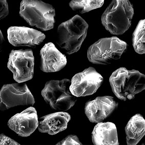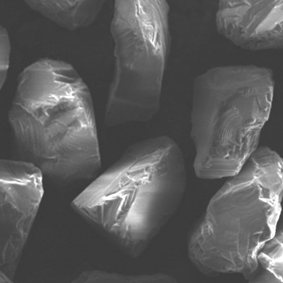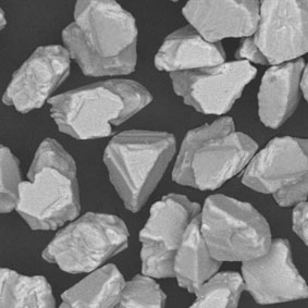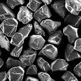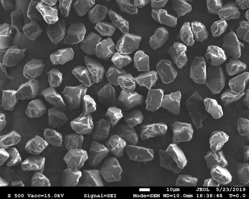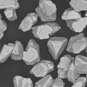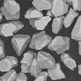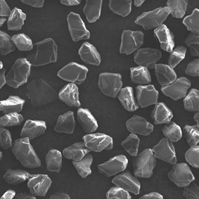 原料采用高強(qiáng)度、高純度的優(yōu)質(zhì)金剛石,經(jīng)特殊的破碎、整形工藝加工,晶形規(guī)則呈接近等積形的多角狀顆粒。